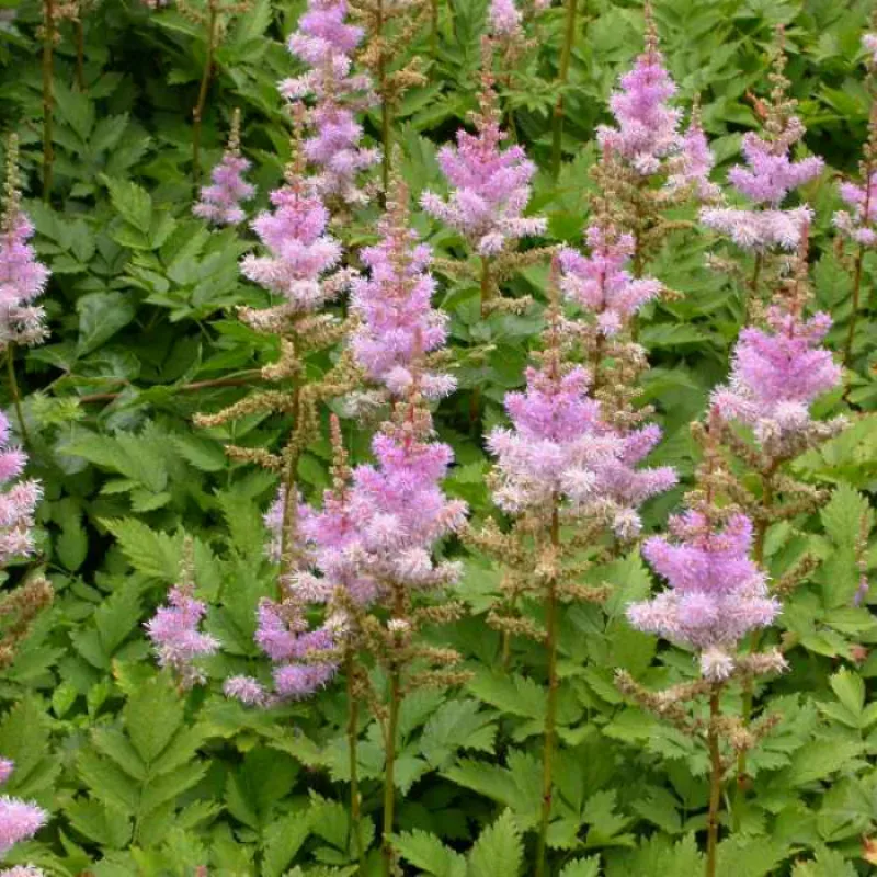 Астильба китайська Пуміла (лат. Astilbe chinensis Pumila) Форма / розмір: Багаторічна рослина до 40 см заввишки. Листя: Листя складні, ажурні, блискучі, з обох сторін по жилах і краю покриті дрібними рудуватими волосками. Прикореневі листя великі, на довгих черешках, стеблові - меншого розміру, на коротких черешках. Квітки: Дрібні, бузково-рожеві, в дуже ефектних щільних суцвіттях 30-35 см завдовжки. Цвіте з серпня до листопада. Посадка і догляд Астильби китайської Пуміла Умови вирощування: Астильба китайська Pumila може рости як на сонячних, так і на напівтінистих ділянках. Слід садити на глибоко розпушені, багаті перегноєм суглинні або торф'яні грунти, на ділянках з порівняно високим рівнем грунтових вод, що забезпечує рослинам рівномірне надходження вологи протягом усього вегетаційного періоду. Після закінчення цвітіння рекомендується обрізати всі відцвілі суцвіття, щоб зберегти декоративність посадок. Обрізку всієї надземної частини проводять після її повного відмирання. Досить морозостійка, виносить пониження температури до -28 ° С. Використання в дизайні: Астильба китайська "Пуміла" (Astilbe chinensis Pumila) використовується в групах, рабатках, міксбордерах, рокарії, в срезке.Купіть астильбу китайську Пуміла Ви можете в нашому інтернет магазині багаторічних квітів і рослин, доставку здійснює в Одесу, Харків, Дніпропетровськ , Херсон, Львів, Вінницю, Кіровоград, а також Київ і область і за всіма іншими містами України.