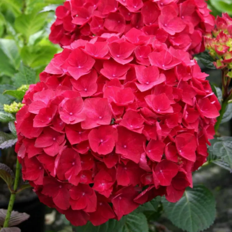 Гортензія крупнолиста Хот Ред (лат. Hydrangea macrophylla Hot Red) Опис: Гортензія крупнолистная Хот Ред дуже красива декоративна рослина, яка росте пишним кущем. Незважаючи на те, що суцвіття досить великі - 10-15 см в діаметрі, пагони не прогинаються під їхньою вагою, а ростуть прямостоячими. Висота і діаметр дорослої рослини 1м. Цвіте на здерев'янілих кінцях однорічних пагонів, тому обрізати їх не варто. Період цвітіння: Червень - вересень. Квітки: Квіти мають яскраво-червоним відтінком, але при високій кислотності грунту набувають фіолетового відтінку. Листя: Насичено-зелені, яйцевидної форми. Гортензія крупнолистная Хот Ред посадка і догляд умо вирощування: Рівномірно зволожені, добре дренованих родючі гумусні грунту, від кислих до нейтральних, уникає вапна. На занадто багатих азотом грунтах погано визріває і дерев'яніє. Висаджувати в півтінь, вологолюбна. Використання в дизайні: Поодинокі, групові посадки, квіти на зрізання, часто вирощується як горшочное рослина.