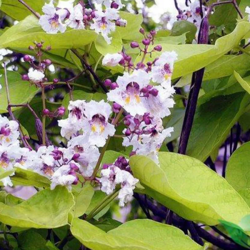 Висота / форма: дерево середньої величини, з розлогою округлою кроною. Висота 8-10 м, ширина 5-8 м. Старі рослини розростаються більше в ширину, ніж у висоту. Швидкість зростання: річний приріст у висоту 25-30 см, завширшки 25 см. Цвітіння / листя: листя розташовані супротивно, найчастіше по 3, дуже великі, серцеподібні, довжиною 10-20 см, розпускаються дуже пізно, на початку червня, при розпусканні яскраві, золотисто-жовті, потім лимонно-жовті, в кінці літа - світло-зелені, обпадають рано, осіннє забарвлення жовте. Квіти численні широкі, 15-30 см в діаметрі, білі волоті з'являються в липні. Окремі квітки форми дзвіночка, білі, серединка з двома жовтими смужками і пурпуровими плямами. Плоди: дуже декоративні боби довжиною 35 см, шириною 6-8 см.