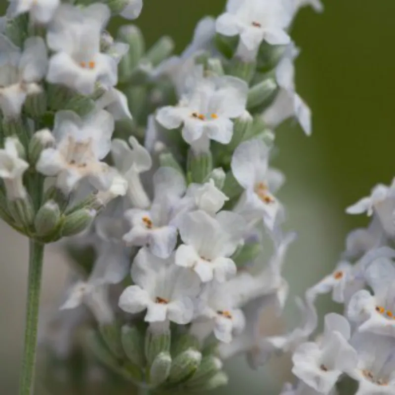 Лаванда вузьколиста Нана Альба (лат. Lavandula angustifolia Nana Alba) Опис: Багаторічний напівчагарник з дерев'янистим корінням, що досягає двох метрів у довжину, і численними пагонами висотою до 60 см, в нижній частині дерев'янистими. Листя: Листки супротивні, лінійні, сріблясто-зеленувато-сірі, з ніжним опущенням. Квітки: Квітки невеликі, двостатеві, зібрані в перервані колосоподібні суцвіття по 6-10 квіток в мутовках, які розташовані на верхівках без листная стебел з проміжками в 0,5-2 см. Час цвітіння: Цвіте в червні-липні білими квітами. Лаванда вузьколиста Нана Альба посадка і догляд Умови вирощування: Добре росте в сонячному, теплом, навіть жаркому місці. Віддає перевагу суху, свіжу, добре пропускає воду, гравійну або піщано-глинистий, помірно поживну, що містить вапно. Використання в дизайні: Підходить для низьких обрамляють огорож, альпійських гірок, сонячних квітників і низьких бордюрів.