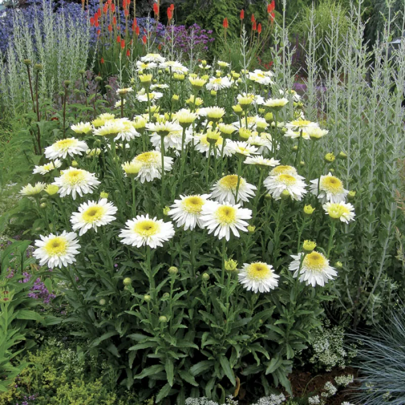 Опис: багаторічна рослина з темно-зеленим листям і шарами великих білосніжних пелюсток, що оточують контрастний жовтий центр. З часом пелюстки з легка згинаються. Висота 60 см.