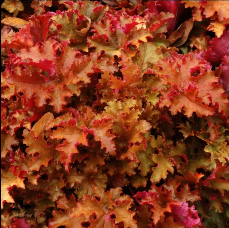 Гейхера Зіппер (лат. HEUCHERA Zipper) Опис: Висота рослини 30см, діаметр 40см. Новий сорт з дуже сильно рифленими великими і щільними листям, які грають усіма відтінками теплих кольорів. Листя: Листя вражають своєю палітрою від оранжевого до золотистого бурштину, з пурпурової спинкою. Плюс до цього завжди видно яскраво-рожева зворотна сторона листа. Квітки: Квітки кремово білі, з'являються в середині літа. Час цвітіння: Травень-червень. Гейхера Зіппер посадка і догляд Умови вирощування: Гейхера - невибагливі рослини. Необхідний мінімум умов при їх вирощуванні універсальний для всіх сортів: глибокий дренаж, плямиста тінь, вологоємна грунт, обов'язкове підгортання один раз на рік або через рік. Рослина невимоглива, але віддає перевагу легким, добре удобрені, окультурені на глибину 20 см грунту. Використання в дизайні: У групових і бордюрних посадках і на зрізання. Декоративну цінність мають не тільки квітки, але і листя, зібрані в розетку. Гейхери чудово підходять для оформлення берегової зони водойм.