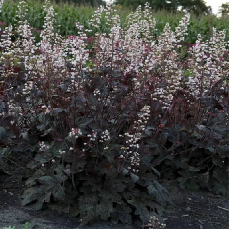 Гейхерелла Інфініті (лат. Heucherella Infinity) Опис: Неймовірно приваблива гейхерелла. Висота 30-45 см. Діаметр 40 см. Квіти: Над подушкою темного листя підносяться пишні хмари ніжно-рожевих суцвіть. Листя: Листя яскрава шоколадно-фіолетова з сріблястим покриттям. Час цвітіння: Травень-жовтень. Умови вирощування: Не переносить замокання і важких грунтів. Ідеальні умови - ажурна півтінь, хороший дренаж. Використання в дизайні: Використовується в групових і бордюрних посадках і на зрізання, добре виглядає на берегове зоні водойм.