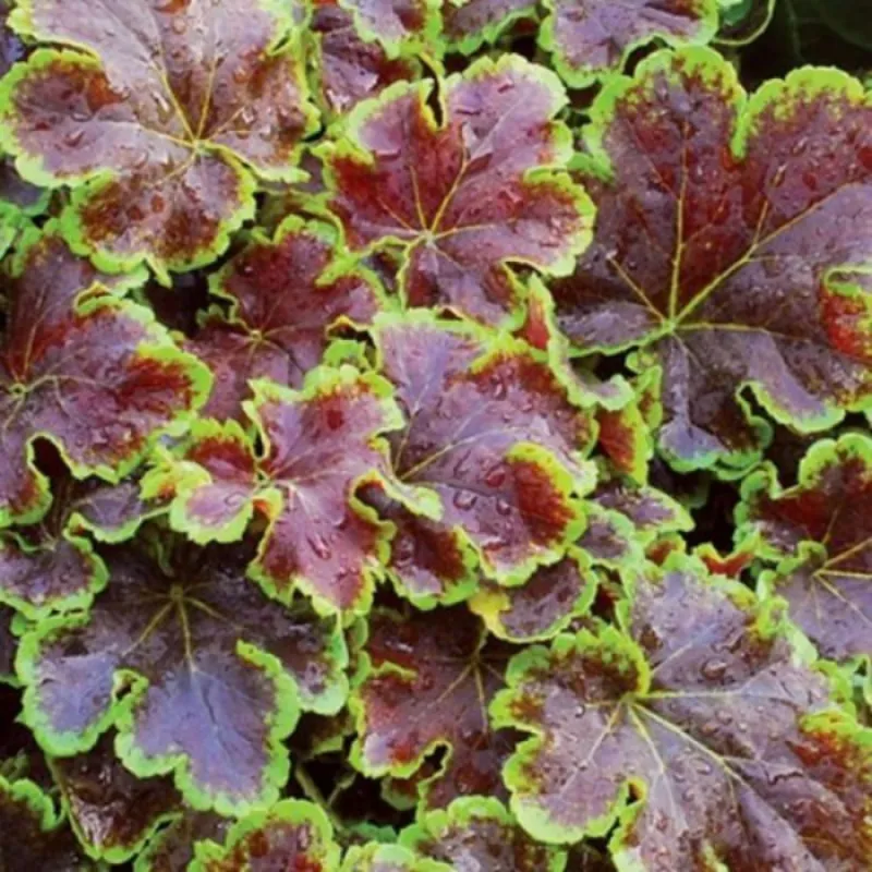 Гейхерелла Солар Екліпс (лат. Heuchera Solar Eclipse) Опис: Невисока почвопокровноє рослина, дуже популярне серед садівників. Висота дорослої рослини може досягати 25-30 см, що підносяться над основним кущем квітконоси додають ще стільки ж. Сорт з унікальною забарвленням квіток і листя, незамінний компаньйон для садових ансамблів. Зовнішня сторона листя пурпурного відтінку з ефектним жилкованием і яскравим контрастним обрамленням. Час цвітіння: Цвіте в липні. Цвітіння тривале - близько 2 місяців. Черешки і квітконоси опушені короткими волосками. Гейхерелла Солар Екліпс посадка і догляд Умови вирощування: Для посадки гейхери найкращим чином підійдуть напівтінисті місця. Якщо ділянка освітлюється сонцем лише в ранкові години - він оптимальний для гейхери. Грунт повинна бути пухкої й добре дренованим, без застою води. Оптимальний рН = 5-6. Гейхера досить зимостійка, але все ж восени рекомендується замульчувати розетки листя. Найбільше гейхера страждає від сонячних опіків і осушення навесні, тому корисним прийомом є її притенение і періодичний полив в цей період. Використання в дизайні: Садівниками гейхера цінується перш за все за тривалість періоду декоративність, адже рослина здатна радувати око з ранньої весни і до самих заморозків. В саду гейхеру іспоользуют для групових змішаних і одновидових посадках, при влаштуванні рабаток, бордюрів, кам'янистих садів.