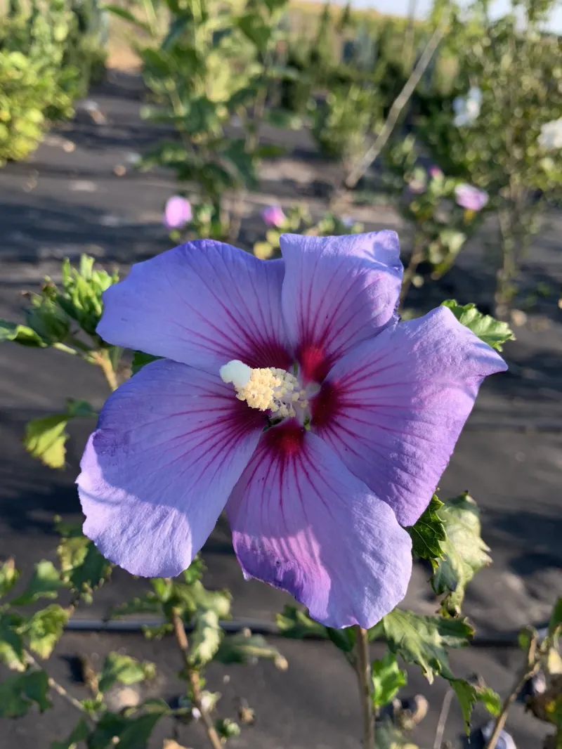 Гібіскус сірійський Азурі Сатин (лат. Hibiscus syriacus Azzurri) Форма: Відноситься до красивоцветущие чагарники. Листопадний чагарник середнього розміру 1,5 - 2 (3) м заввишки і 1 -1,5 м шириною. Період цвітіння: З середини літа і до осені. Умови вирощування: Віддає перевагу добре освітлені, захищені від вітру місця. Полив у вимірах. воліє поживні, пухкі грунту. Без застою води. Легко розмножується насінням і живцями. Використання в дизайні: Добре виглядає як соло, так і в групі кущів або в живоплоту. Особливості: Цей красивоцветущий кущ росте швидко і потребує формування шляхом обрізки (навесні слід укорочувати пагони на 1/3 довжини, а влітку прищипувати швидкозростаючі галузі). Цвіте на однорічних пагонах.