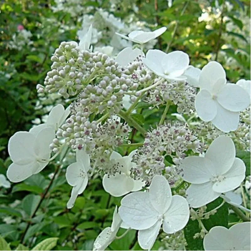 Гортензія волотиста Прим Вайт - Долпрім (лат. Hydrangea paniculata Primewhite Dolprim) Гортензія волотисте Прим Вайт - Долпрім - вертикальний, що поширюється, листяний чагарник з темними стеблами, що несуть яйцеподібні, загострені, жильні, темно-зелене листя і великі, відкриті, конічні волоті ароматних білих квітів. Ранній сорт-час цвітіння з пізньої весни в літо. Часто цвітіння відновлюється на початку осені. Висота / ширина: висота куща 1,5 м, ширина - 2 м. Час цвітіння: Цвіте на прирості попереднього року. Прим Вайт дуже рано розквітає - з кінця травня або початку червня (в залежності від регіону). Цей чагарник виробляє витончені білі, злегка плоскі квіткові шапки. У рясних стерильних квіток Прим Вайт є великі чашолистки. Квітки на початку цвітіння пофарбовані в кремовий колір, а потім стають білими. У хороших умовах друге цвітіння продовжує декоративну цінність в серпні - сентябре.Ето рослина з прекрасним сіро-зеленим стовбуром, блідо-зеленим листям і дуже червоними стеблами має невелике зростання. Добре розгалужений, у нього більш правильна форма і кращі показники зростання, ніж у його батьківської рослини - гортензії Дхарума. Забарвлення квітки: Гортензія Прим Вайт має елегантні білі, злегка плоскі, що не великі волоті з великою кількістю стерильних квіток з дуже великими чашолистки. Квітки в фазі розпускання мають вершковий, ванільний відтінок, при повному розпуск стають сліпуче білими. Місце і грунт: Любить грунту багаті гумусом, але адаптується на будь-яких, любить добре освітлені місця, але зростає і в півтіні. Особливості: Обрізку рекомендується проводити відразу після цвітіння, скорочуючи відцвілі гілки і вирізаючи слабкі пагони. Використання в дизайні: Прим Вайт використовується в солітерних і групових посадках в місцях відпочинку, на газонах і в палісадниках, для створення змішаних з багатолітниками посадок. Завдяки своїм компактним розмірам ідеально підходить для маленьких садів, балконів і терас. Так що якщо Ви обмежені в площі, це сорт гортензії - один з тих, що може радувати ваше око виростаючи в контейнері навіть на міському балконе.Пітомнік садового центру ГрінМарт спеціалізується на вирощуванні гортензій і вже кілька років, ми пропонуємо саджанці різного розміру.