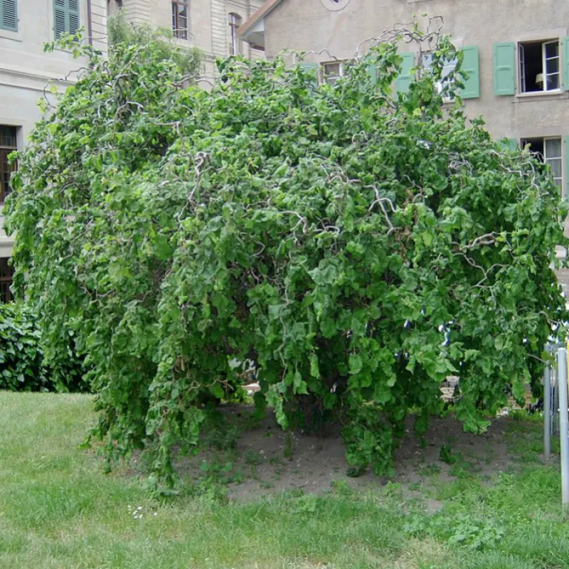 Ліщина звичайна Конторта (лат. Corylus avellana Contorta) Опис: Являє собою невисоке дерево або чагарник до 1,5-2,5 (4,5) м у висоту і 1,5-2,5 м в ширину. Крона густа, шатровідной, розлога. Рослина медленнорастущєє. Пагони дуже декоративні, викривлені і закручені, сильно переплітаються. Коренева система поверхнева, неглибока, добре розвинена, з великою кількістю тонких коренів. Річний приріст: Річний приріст сягає 25 см у висоту і ширину. Листя: Листя асиметричні, трохи скручені, сильно зморшкуваті, до 12 см в довжину, темно-зеленого кольору, опушені по жилах. На початку листопада листя змінюють свій колір на жовтий або оранжево-жовтий і в кінці місяця опадають. Цвітіння: Цвіте ранньою весною до розпускання листя (в квітні). Рослина однодомна (чоловічі та жіночі квітки ростуть окремо на одній рослині). Чоловічі квітки - витончено звисають жовті сережки, що залишаються на деякий час після опадання листя. Жіночі квітки непоказні ниркоподібні суцвіття, невеликі, червоного кольору. Плоди: Плодоносить рідко. Плоди - їстівні горішки округлої або довгастої форми. Зріють у вересні-жовтні. Ліщина звичайна Конторта посадка і догляд Умови вирощування: Тіні, але в тіні не плодоносить, віддає перевагу сонячним і відкриті місця. Не любить заболочування. Чутлива до засолення і посухи. Може рости на всіх типах грунтів, від сухих до вологих і від слабокислих до лужних. Віддає перевагу родючому грунту. Не переносить сильнокислую. Використання в дизайні: добре виглядає солітером і в складі невеликих квіткових композицій в малих садах. Дуже декоративна після опадання листя, в зимовий період і ранньою весною до розпускання листя. Ідеально підійде для створення осінніх графічних етюдів.