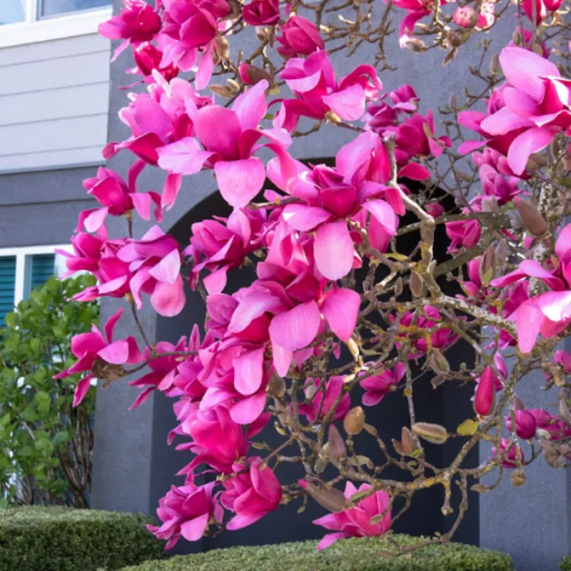 Магнолія Вулкан (лат.Magnolia Vulcan) Форма: Листопадне дерево росте помірно, вертикально. Розмір: Висота і ширина рослини приблизно 3-5м, при сприятливих умовах досягає у висоту 8 м. Листя: Назад яйцеподібні, блискучі, темно-зелені. Цвітіння: Квітки бокаловидні, великі до 25 см, повні, темно-рубінового кольору, дуже запашні. Цвітіння пізні. Умови вирощування: Віддає перевагу сонячному місцю посадки, захищене від протягів і сильних вітрів. Грунт повинна бути пухка, свіжа, волога, добре дренированная, родюча, бажано з перегноєм і злегка кисла. Використання в дизайні: Магнолію найчастіше використовують в солітерних посадках. Дивовижні по красі композиції виходять, якщо посадити її на тлі вічнозелених огорож або чагарникових заростей.
