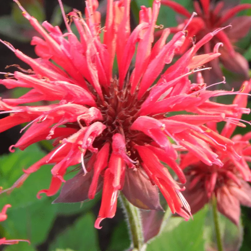 Монарда гібридна має довге кореневище, пагони прямі або гіллясті. Використовується для вирощування в групах і квітниках. Практично весь сезон має декоративний зовнішній вигляд. Висота до 1.5 м. Цвітіння: середина травня. Листя довгасте, має зубчасту кромку. Квітки невеликого розміру, пурпурного відтінку, або темно-бордові. Для посадки вибрати правильний день, а саме сухий і сонячний. Глибина лунок не має перевищувати 2,5 см, поверхню викопаних грядок засипати піском. Після посадки клумбу зволожити. Коли будуть помічені перші сходи, грядки прорідити, видаливши найслабші екземпляри і бур'яни. Восени і навесні монарді не потрібна велика кількість вологи, а ось влітку поливати її частіше. Як і будь-яка інша квітуча рослина, монарда потребує своєчасного підживлення. У період вегетації слід здійснювати підживлення як мінімум 2 рази на місяць. Мульчування і розпушування грядок необхідні для того, щоб після поливу ґрунт довше зберігав вологу. Використовується для вирощування в групах і квітниках.