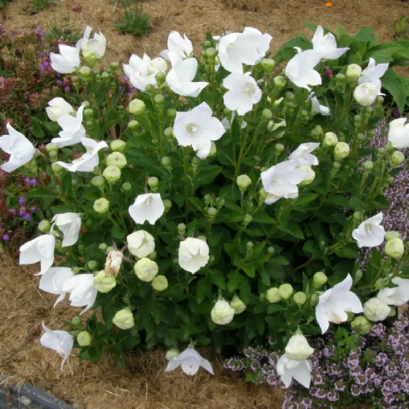 Платикодон Астра Вайт (лат. Platycodon Astra White) Опис: Справжній багаторічна рослина, і, якщо у Вас вийде вибрати відповідне для нього місце, він здатний прикрашати ваш квітник довгі роки. Серед низькорослих платикодон є найбільш популярними. Він відрізняється компактними розмірами, близько 20 см у висоту. Листя: Листя сизо-зелені, гладкі, восени жовто-багряні, служать прикрасою клумби до заморозків. Квітки: Квітки досить великі, широко відкриті дзвіночки і мають форму зірки. Вони схожі скоріше не на дзвіночок, а на чашу. Шірококолокольчік гарний вже в бутонах - великих, як китайські ліхтарики. Пелюстки квітки є досить товстими, через що період цвітіння рослини досить тривалий і становить близько 60 днів. Дорослий багатостебловий кущ цвіте з липня і майже до кінця серпня. Платикодон Астра Вайт посадка і догляд Умови вирощування: платикодон на одному місці ростуть 5-7 років без пересадки, не агресивні, добре уживаються з іншими рослинами. Сама рослина любить сонячні місця, пухку, з додаванням органіки, дренированную і помірно вологий грунт. Земля повинна бути не надто лужна. Не любить заболочених ділянок. Платикодон добре зимує під снігом, що не вимерзає. Використання в дизайні: Дуже ефектно виглядає як в групових так і одиночних посадках.