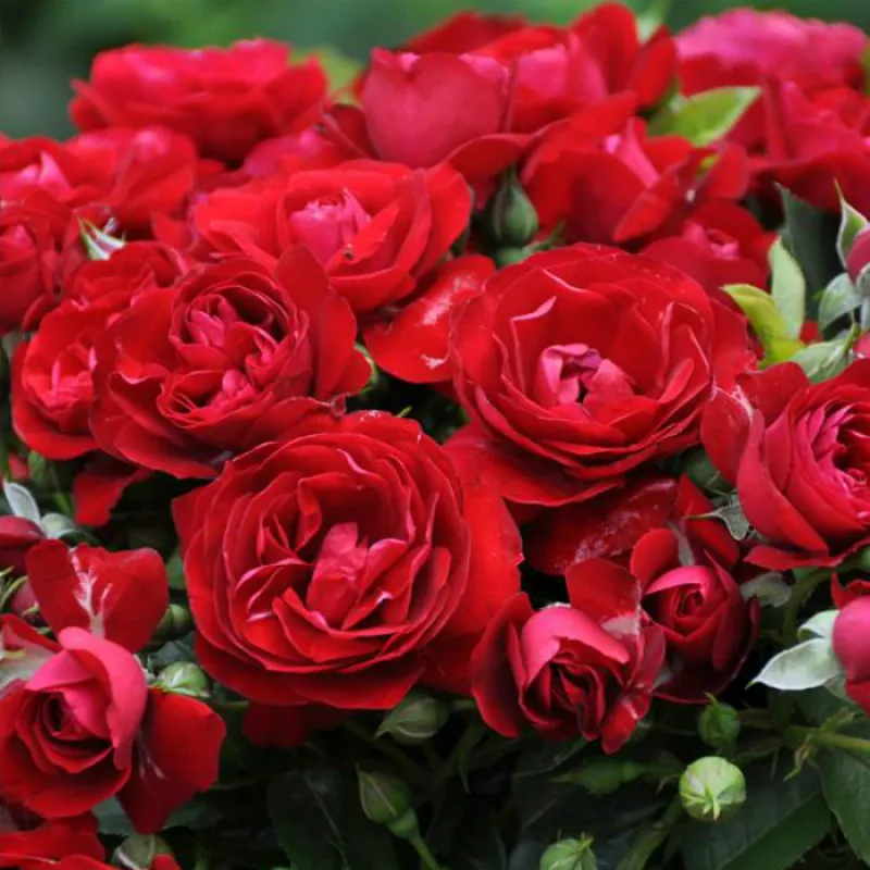 Опис: чудова рясно квітуча флорибунда, порадує ваш погляд яскравістю своїх бутонів. Компактний сорт троянд, підходить для вирощування в усіх садах. Висота дорослого куща 60-80 см. Ширина куща джо 50 см. Цвітіння дивно рясне, повторне з початку червня до кінця вересня. Квітки: троянда з яскраво-червоними, бархатистими, чашоподібними квітками 5-6 см в діаметрі, з'являються в великих зонтиковидних кистях 5-10 бутонів. У повному розпуску квітки показують серединку з яскраво-жовтими тичинками.
