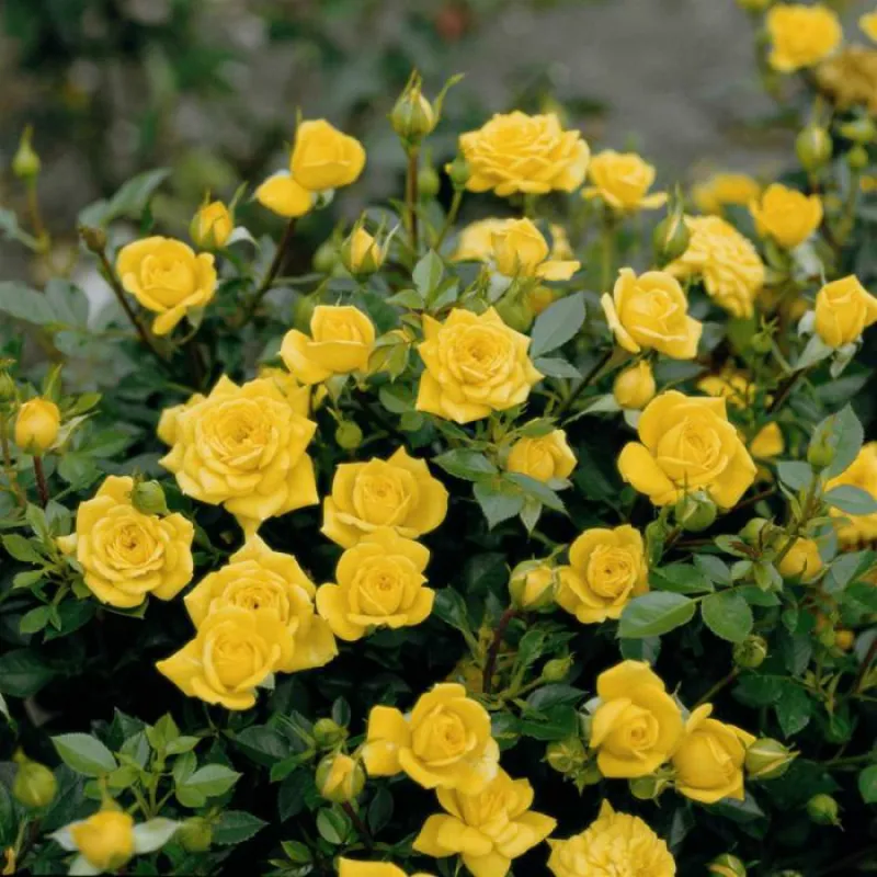 Опис: Дуже популярний сорт. Мініатюрні троянди ні в чому не поступаються своїм класичним родичкам, славляться рясним цвітінням і красивим кущем, завжди густо покритим витонченим листям. Квітка: квітки напівмахрові, насиченого жовтого кольору, з легким ароматом, зібрані в суцвіття до 10 штук. Кущ компактний, гіллястий, кулястої форми, з жорстким зеленим листям, висота 30-45 см. Цвітіння тривале протягом усього сезону.