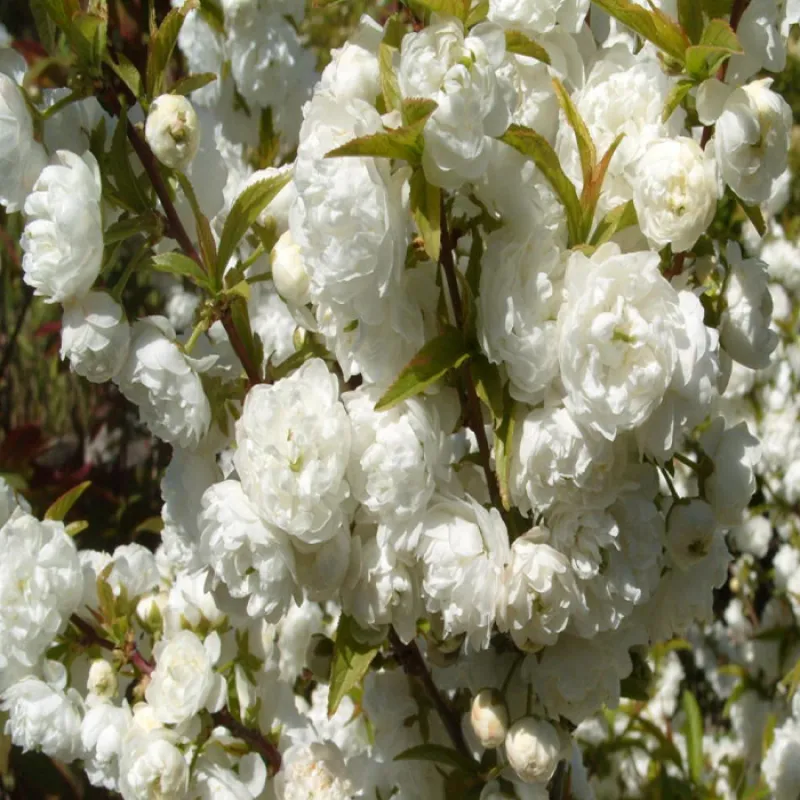 Опис: округлий кущ з блідо-зеленим листям. Висота/форма: висота штамба 220 см., діаметр крони до 150 см. Листопадний великий чагарник або невелике дерево. Швидкість зростання: швидко зростаючий чагарник. Річний приріст близько 20 см. Цвітіння/листя: основні гілки строго вертикальні, сильні, з віком широко розкинуті. Листя світло-зеленого кольору, довгастої форми, довжиною до 10 см. Зверху вони голі, знизу рідко опущені. Осіннє забарвлення жовто-оранжеве. Цвіте з кінця травня до червня. Квітки густо-махрові, до 2 см, білосніжні, поодинокі або по 2-3, розпускаються одночасно з листям.