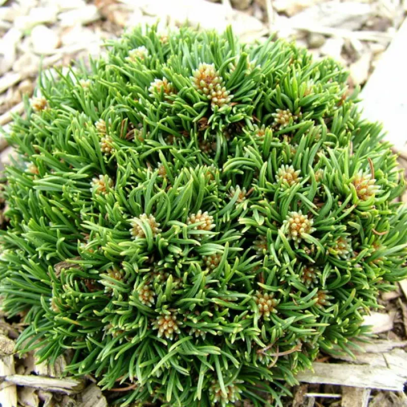 Форма: відрізняється чудовою, дуже щільною, напівшароподібною однорідною кроною. Річний приріст становить від 1,5 до 2,5 см, рослина досягає до 20 років - 35-40 см у висоту і до 0 , 5 м ширини. Хвоя: яскраво-зеленого кольору. Шишки/плоди: пагони прямостоячі, з густою, щільною, довгою, скрученої, яскраво-зеленою хвоєю, голки зібрані в пучки по дві.