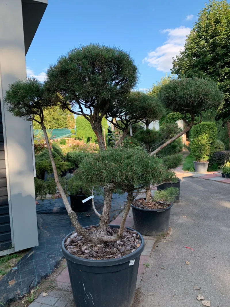 Сосна звичайна бонсай (Pinus sylvestris) — це класична хвойна рослина, сформована в елегантному бонсай-стилі. Має висоту 150–170 см і вирізняється декоративною кроною, сформованою у вигляді «хмаринок» на різних рівнях. Голки жорсткі, довжиною 4–7 см, синювато-зеленого кольору, зберігають декоративність упродовж року. Бонсай-сосна чудово поєднує природність та мистецтво садового дизайну. Вона надає саду східного колориту, особливо ефектна у композиціях із камінням, гравієм, карликовими кущами. Рослина невибаглива, морозостійка, любить сонячні місця та дренований ґрунт. Ідеально підходить для японських садів, сучасних ландшафтів, як солітер чи акцентна рослина біля водойм, терас або в кам’янистих садах.